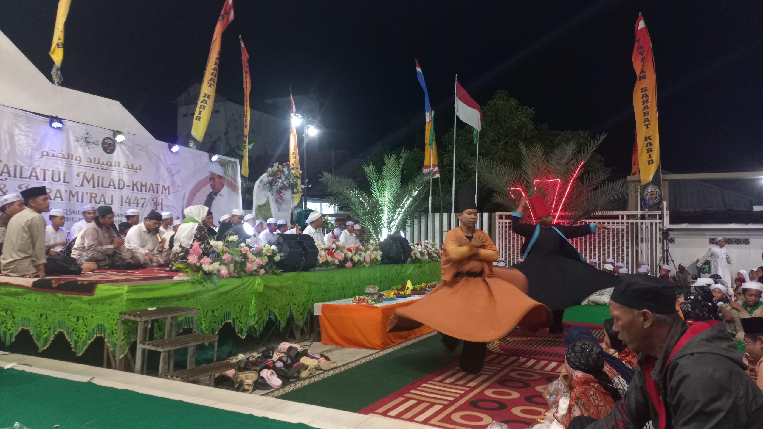 Rangkaian kegiatan diawali dengan pembacaan Maulid Habsyi, dilanjutkan penampilan santri TPA, khataman Al-Qur’an, pembacaan Mahallul Qiyam, doa bersama, serta tausiah keagamaan yang disampaikan oleh Kiai Agus Habibullah dari Pangkalan Bun, Kabupaten Kotawaringin Barat. Acara semakin semarak dengan lantunan Maulid Habsyi yang diiringi tarian sufi, menambah kekhusyukan dan keindahan suasana.
