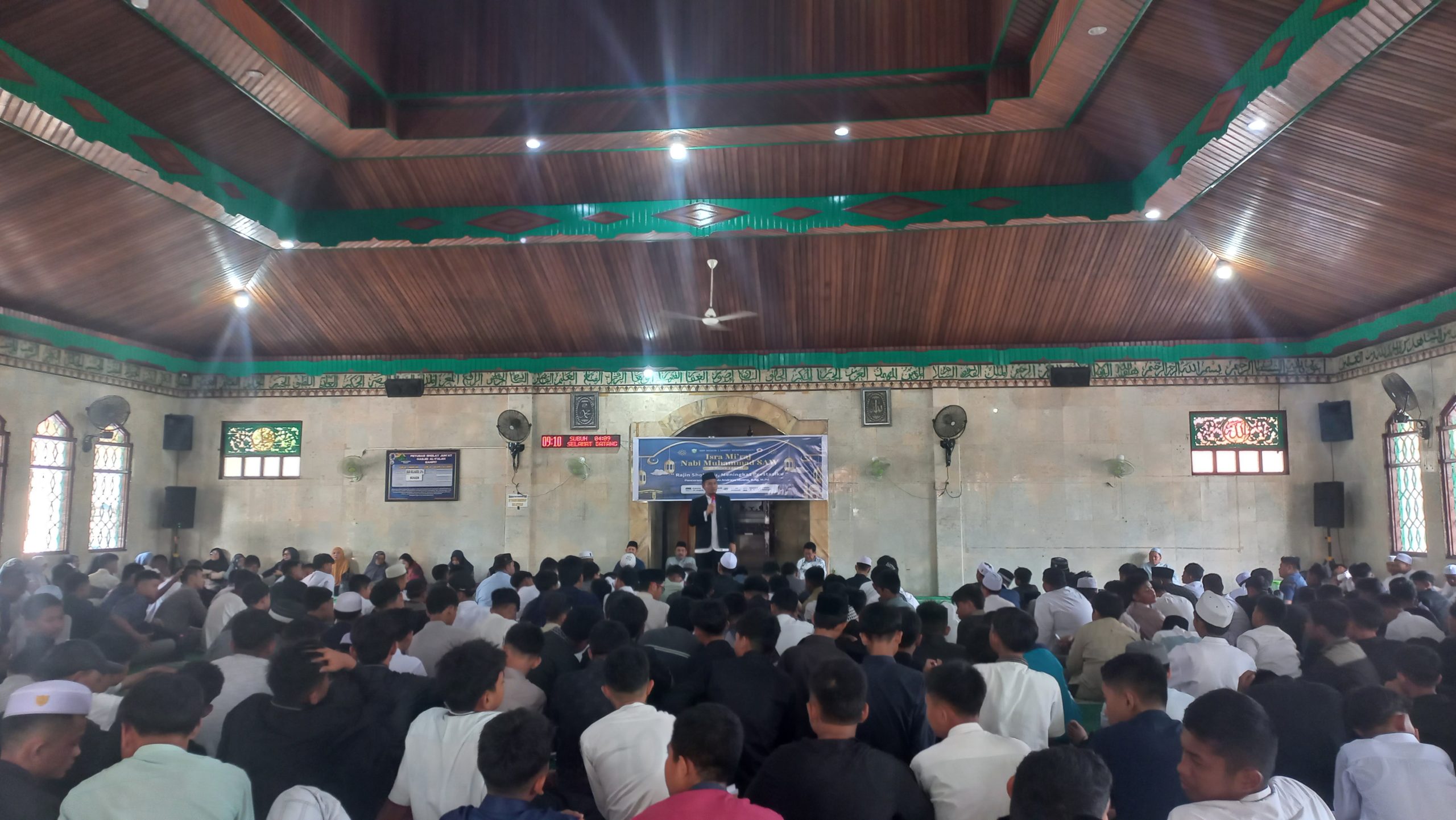 Para siswa terlihat antusias dan khusyuk menyimak tausiyah yang disampaikan, mencerminkan kesungguhan mereka dalam memahami makna Isra Mikraj.